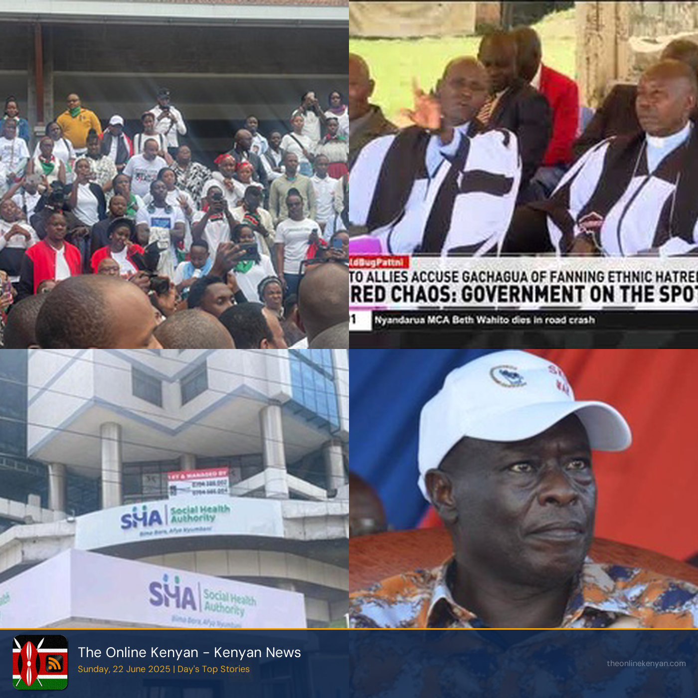 Governor Sakaja denies claims of paying goons to incite protests last week. He states these are tactics by his political opponents to damage his reputation. Francis Atwoli urges Kenyans to support the Nairobi expansion project, highlighting its potential benefits for city infrastructure and growth. Beth Wahito, the Nyandarua County representative, has died in a road accident on the Nairobi-Nakuru highway. Tensions are rising in Imbolot, Narok, as local youth patrol the Keringani land, causing unrest in the community. Kenya Police and Gor Mahia celebrate after emerging champions of the FKF Premier League, reflecting a successful season for the football club. On June 25, a special prayer service will be held for parents who have lost their children, offering support and remembrance. Political dynamics between President Ruto and Deputy President Rigathi Gachagua are intensifying as the 2027 elections approach. Church leaders are calling for cooperation between youth and the government to avoid division ahead of June 25 discussions. Deputy President Rigathi Gachagua alleges that the government is plotting against the opposition, raising concerns about political tensions. Some leaders in Kenya Kwanza emphasize the importance of maintaining a good relationship between the police and the public for peace and security. Speaker Moses Wetangula stresses the need for mature politics in Kenya to ensure responsible leadership and governance. The government is set to sign more labor export agreements to enhance employment opportunities for Kenyans abroad, according to Trade CS Lee Kinyanjui. Housing and Urban Development PS Charles Hinga announces that salaried workers will be prioritized for affordable housing units, shifting from earlier plans. A group of MCAs supports Manyatta MP Gitonga Mukunji for the Embu Governor seat in the 2027 elections following a closed-door meeting. The Kenya Defence Forces (KDF) has conducted a free medical camp for residents of Gombato-Bongwe, providing essential health services to the community.
