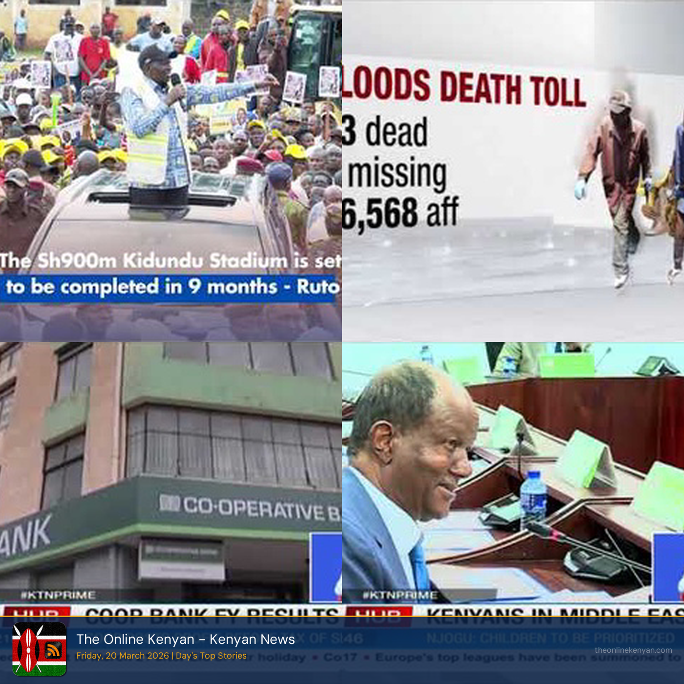 Co-op Bank posts KSh 40.3B pre-tax profit, 15.8% growth: Co-operative Bank of Kenya has announced a significant financial performance, reporting a KSh 40.3 billion pre-tax profit, representing a substantial 15.8% growth in profitability. The Cooperative Bank has also announced a notable increase in its proposed dividend payout to shareholders, recommending a dividend of Sh2.50 per share compared to the previous year's payout. Separately, SACCOs in Kenya are urging Parliament to expedite the 2025 Amendment Bill, highlighting its importance for their sector. The World Bank has additionally banned PwC Kenya from participating in World Bank-funded projects for 21 months due to fraudulent activities stemming from an investigation into a past audit engagement. Muslims celebrate Eid-ul-Fitr at venues across Kenya: Muslim faithful congregated at the newly renovated Kamukunji Grounds for their Eid prayers, marking a significant occasion at the revitalized location. Muslims across Kenya gathered to celebrate Eid-ul-Fitr, marking the end of Ramadan, with prayers held at various locations including the prominent Sir Ali Grounds in Ngara, Nairobi. Additionally, Muslims in Mombasa County gathered at Masjid Ummu Kulthum in Kizingo for special prayers marking the end of Ramadan. Religious leaders in Kilifi County are separately appealing to President William Ruto and Opposition leaders to cease using inflammatory language amidst ongoing political tensions. Trump Adds 6 African Countries on Visa Bond List: The Trump administration has introduced a Visa Bond Pilot program requiring citizens from Ethiopia and six other African nations, along with six non-African countries, to post bonds of up to Ksh1.9 million ($15,000) for visa applications. Kenya is on high alert as Defence Cabinet Secretary Soipan Tuya assured the nation of continuous vigilance amidst escalating global security risks, particularly those stemming from the US-Iran-Israel conflict and wider Middle East instability. European Union leaders are vowing to remain vigilant against potential migratory flows and the spillover of Middle East conflicts, emphasizing preparedness and border security. Meteorological Dept warns Kenyans: heavy rains start tonight: The Kenya Meteorological Department has issued a warning of impending heavy rains expected to start tonight across the country. The warning covers many parts of Kenya and is expected to persist through next week. Meanwhile, the meteorological department is urging Kenyans to exercise caution as forecasts indicate the imminent arrival of heavy rainfall. This follows the department's earlier issuance of a heavy rainfall warning across Kenya, with authorities preparing for potential flooding and related impacts. President Ruto launches Sh900 million Kidundu Stadium in Vihiga: President William Ruto has officially launched the construction of the Sh900 million Kidundu Stadium in Vihiga County, with the Kenya Army tasked to oversee the project. The stadium is expected to be completed within the next 9 months. This development represents a dual gift to the Western Kenya region, focusing on development and economic empowerment. The project aims to strengthen the President's political base and foster growth in the area. Meanwhile, Nominated MP David Kuria has stated he does not directly support the president but argues that blame for economic challenges is not solely on one side, questioning the effectiveness of the "Maskio" initiative in boosting the economy. Kenya on Verge of Losing AFCON Hosting Rights: Kenya faces the risk of losing its hosting rights for the Africa Cup of Nations (AFCON) next year due to a failure to pay the required hosting fees. The Kenyan government is actively seeking United Kingdom investor funding to develop world-class sports infrastructure, mirroring the UK's successful model. This initiative was a key topic during a meeting between Kenya's Interior Cabinet Secretary Kipchumba Murkomen and the UK's Minister of Border Security and Asylum Alex Norris in London. Kenya's Bomas International Convention Centre (BICC) project has reached 40% completion, showcasing significant progress in developing world-class MICE facilities to boost Kenya's tourism and economic transformation. Kenya Eyes Export Boom as China Opens Duty-Free Market: Kenya is poised for a significant export boost as China announced zero-tariff access for Kenyan goods starting May 1, 2026, marking a pivotal shift towards an export-led economy. The Ministry of Foreign Affairs in Nairobi hosted the African Diplomatic Corps to outline Kenya's foreign policy priorities and its vision for the continent's developmental agenda. Deputy President Kithure Kindiki announced that a broad-based government, led by President Ruto, is driving massive nationwide development, ensuring no region is left behind. Nairobi Hospital dismisses collapse claims, says facility financially stable: The Nairobi Hospital has officially debunked claims of financial collapse and operational instability, asserting its solid standing and ongoing recovery from past disruptions. A Medical Advisory Committee (MAC) at The Nairobi Hospital has disowned five of its members who petitioned President William Ruto regarding management disputes, citing procedural breaches and misleading information. Kenya's Social Health Authority (SHA) faces a critical sustainability crisis, with revenue streams failing to cover mounting operational costs, according to warnings from Members of Parliament.